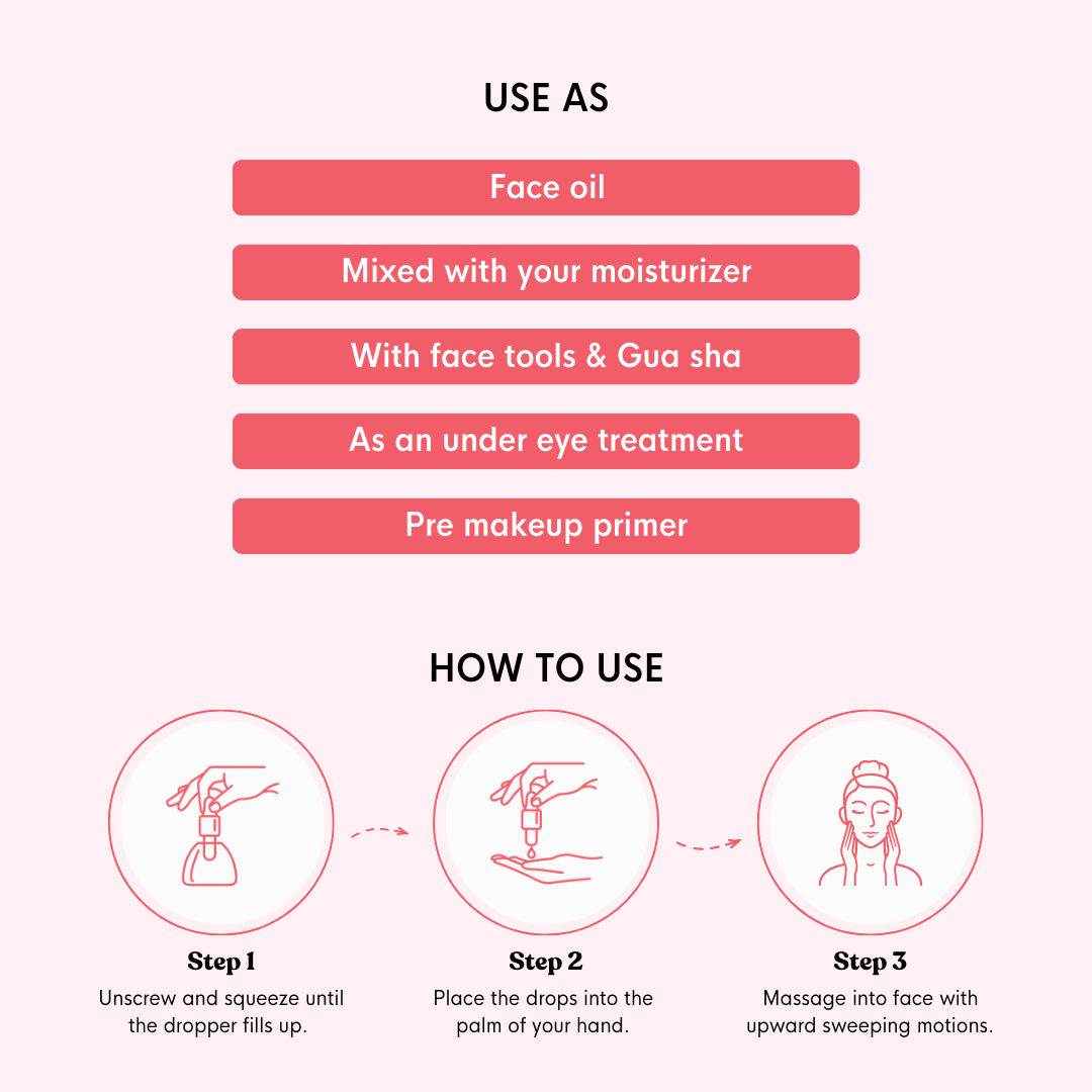 Simply dispense a few drops of the oil onto your fingertips and mix it with a small amount of your moisturizer before applying to your face.