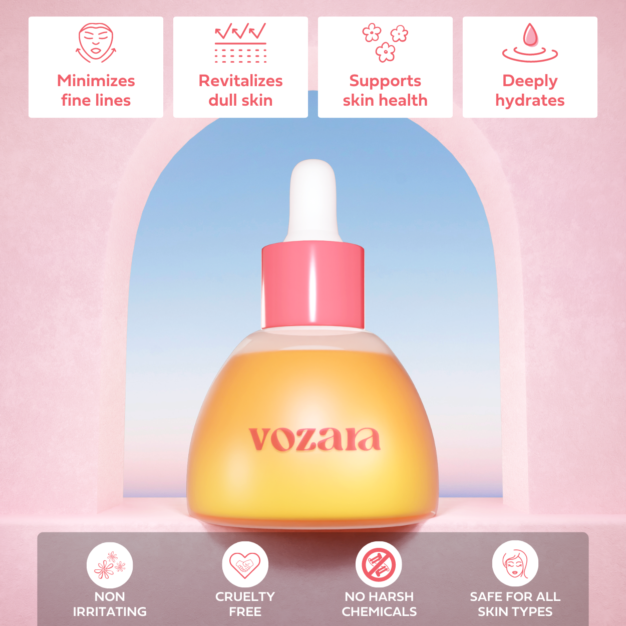 Gorgeous Glow Face Oil is made with a blend of high-quality, natural and potent ingredients, including VITIS VINIFERA Seed Oil, Jojoba Seed Oil, and Camellia Seed Oil, which are known for their nourishing and skin-beneficial properties.
